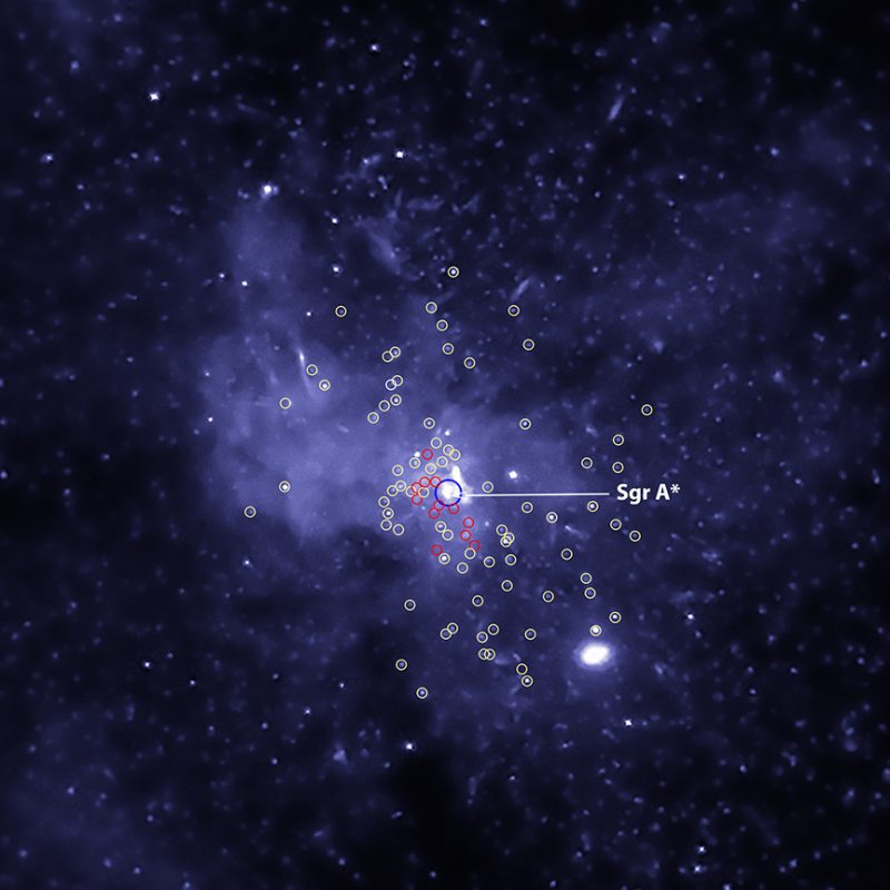 دانشمندان برای جستجو به دنبال دوتاییهای پرتو اکس در اطراف *Sagittarius A، از اطلاعات رصدخانهی X-Ray چندرا (Chandra) استفاده کردند. دوتایی پرتوی ایکس (X-Ray Binaries) سیستمهایی هستند که در آنها یک سیاهچاله با فاصلهی کمی از یک ستاره به دور آن میگردد و با کشیدن ماده از ستاره به سمت خودش، پرتوی اکس ساتع میکند. آنان طیف پرتوی اکس از منابعی با فاصلهی ۱۲ سال نوری از مرکز کهکشان را مورد بررسی قرار دادند. در بیانیهای که از سوی رصدخانهی Chandra منتشر شد آمده است: «آنان ۱۴ دوتایی پرتوی اکس در فاصلهی ۳ سال نوری با *Sgr A پیدا کردند. دو منبع پرتوی اکس که بر اساس مطالعات قبلی احتمالاً مربوط به ستارههای نوترونی بود، از نتایج حذف شد. سیستمهای بایناری باقیمانده در عکس زیر با دایرههای قرمز رنگ نمایش داده شدهاند. منابع دیگر که پرتوی اکس با انرژی بسیار بالا ساتع میکردند با رنگ سفید مشخص شدهاند که به احتمال زیاد سیستمهای دوتاییای هستند که در آنها یک کوتولهی سفید وجود دارد. هیلی و همکارانش به این نتیجه رسیدند که اکثر این دوجین سیستم شامل یک سیاهچاله هستند.»